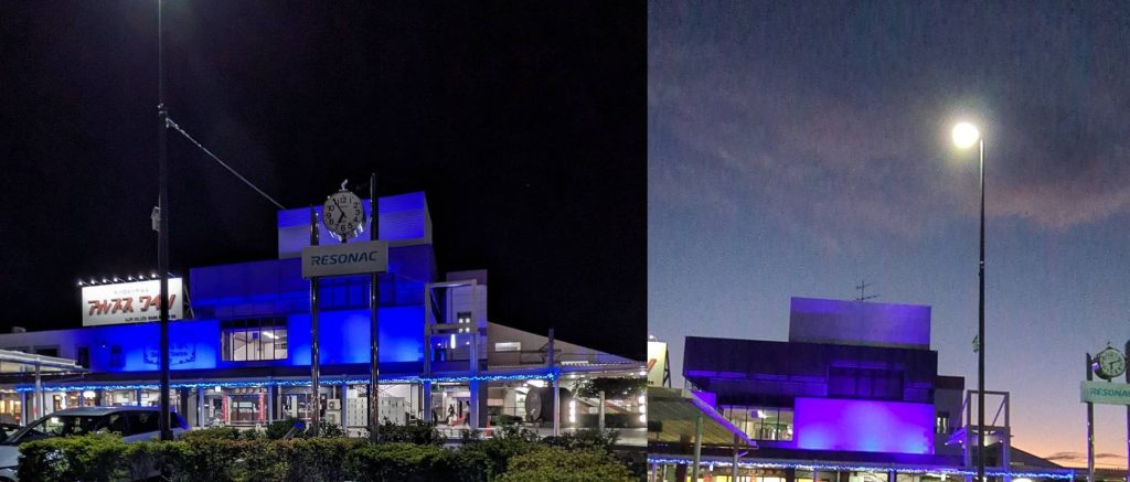 夜には、塩尻駅で、ブルーライトアップセレモニーが行われました。